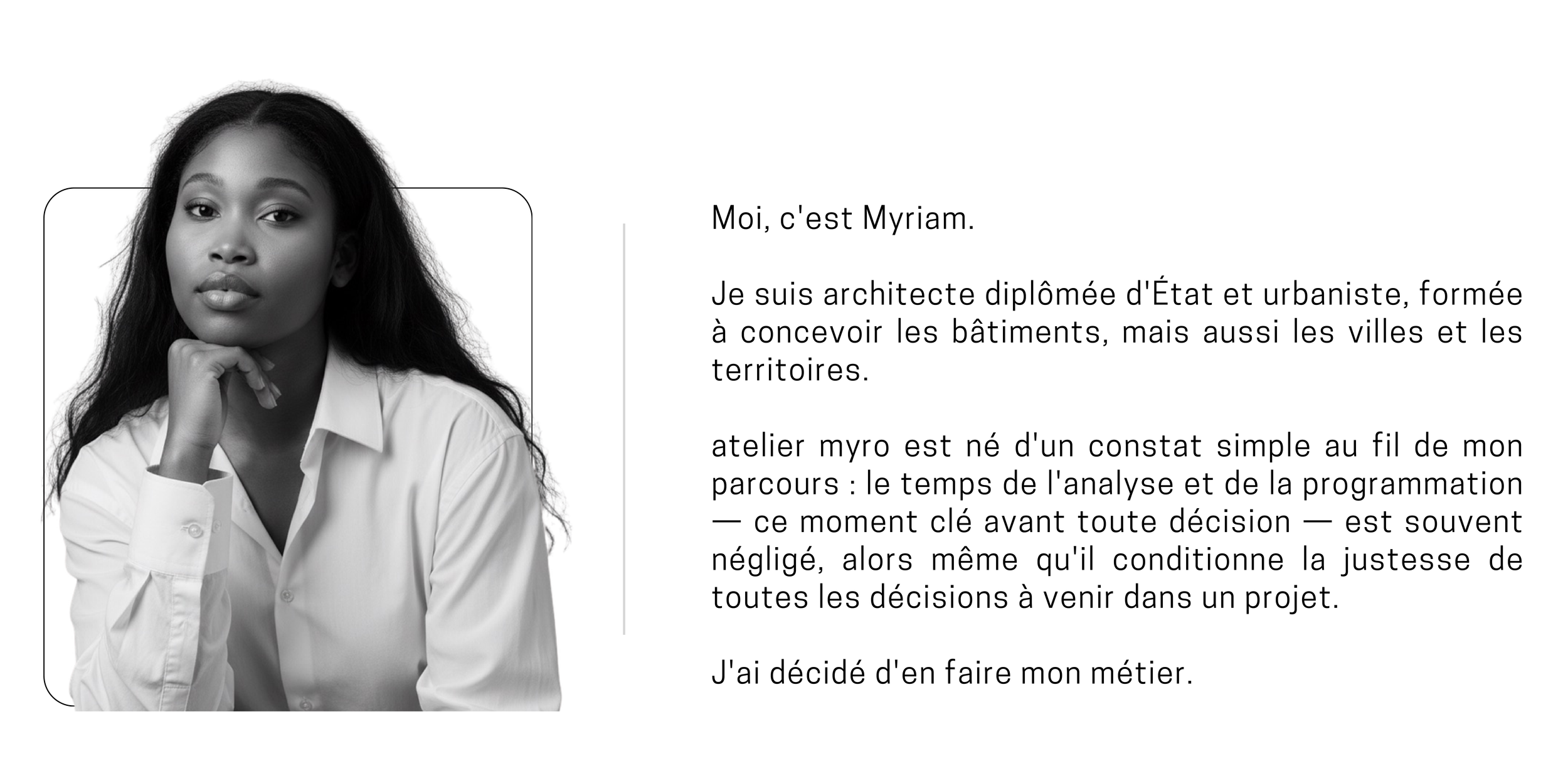 Moi, c'est Myriam.Je suis architecte diplômée d'État et urbaniste, formée à concevoir les bâtiments, mais aussi les villes et les territoires. atelier myro est né d'un constat simple au fil de mon parcours : le temps de l'analyse et de la programmation — ce moment clé avant toute décision — est souvent négligé, alors même qu'il conditionne la justesse de toutes les décisions à venir dans un projet.