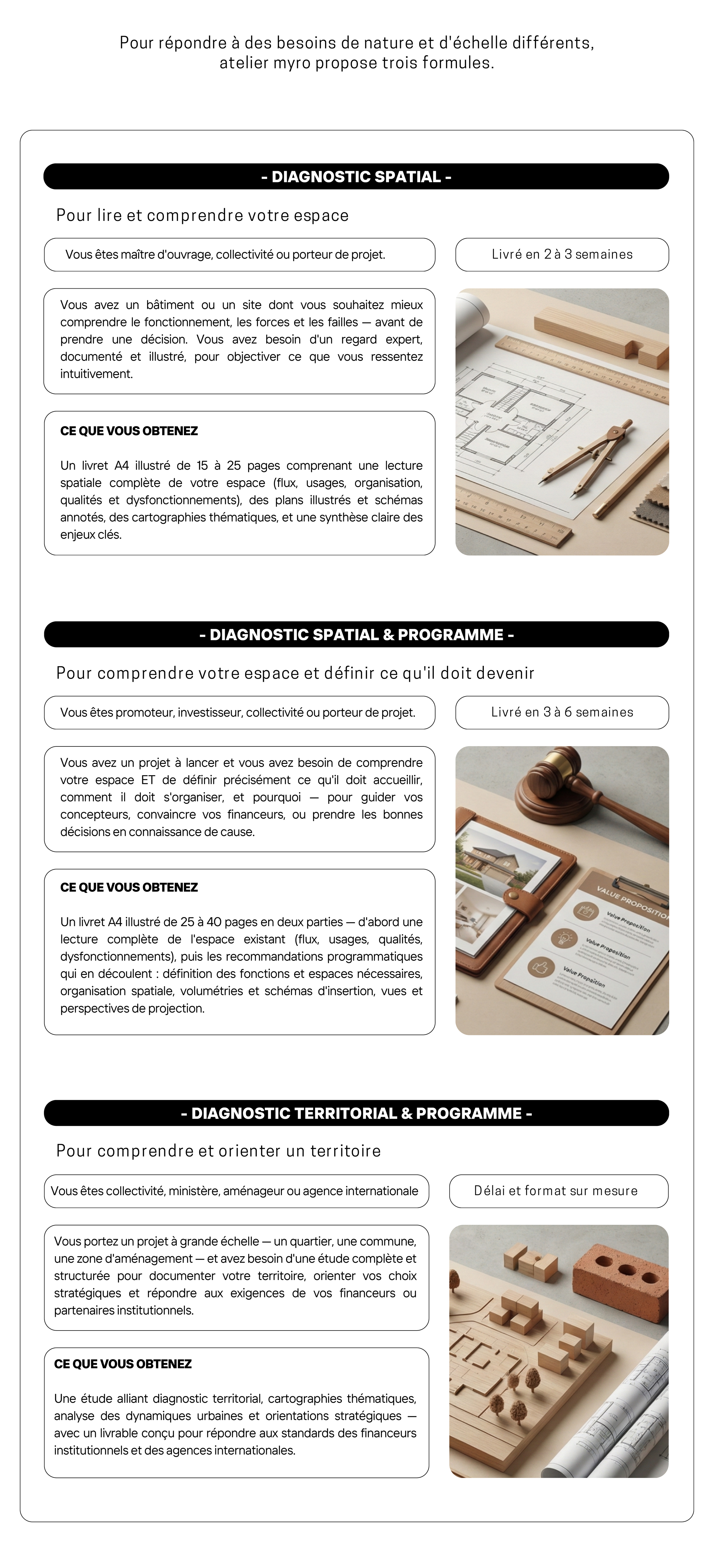 Pour répondre à des besoins de nature et d'échelle différents, atelier myro propose trois formules.