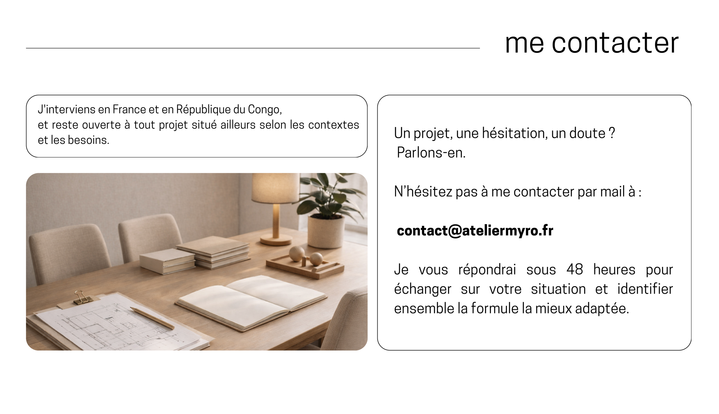 Un projet, une hésitation, un doute ? Parlons-en. N’hésitez pas à me contacter par mail à : contact@ateliermyro.fr Je vous répondrai sous 48 heures pour échanger sur votre situation et identifier ensemble la formule la mieux adaptée. atelier myro · Myriam OBA MASSON Architecte diplôme d’etat - Urbaniste