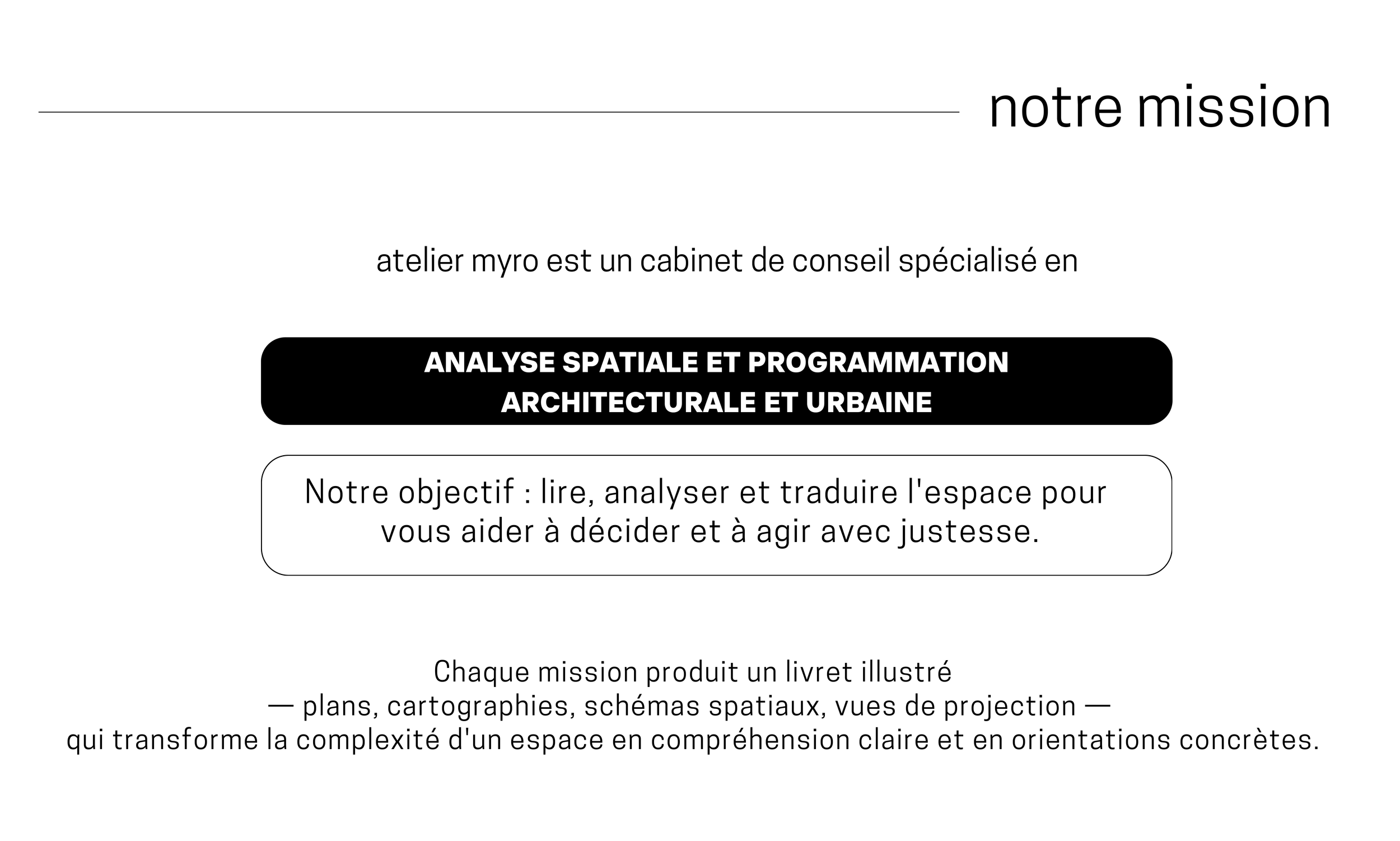 atelier myro est un cabinet de conseil spécialisé en analyse spatiale et programmation architecturale et urbaine. Notre objectif : lire, analyser et traduire l'espace pour vous aider à décider et à agir avec justesse.